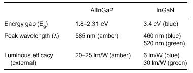 电子能量隙中的能量隙,称为辐射重组,产生光子(即,光),而分流能量转变,称为非辐射重组,产生声子(即加热)。典型的Alingap LED和针对不同峰值波长的IngaN LED的发光效率如下表所示。GydF4y2Ba