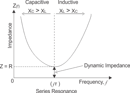 在串联RLC电路中的谐振,两个电抗相等,相互抵消。因此,在谐振串联RLC电路中,对电流流动的反对仅仅是由于电阻。谐振时串联RLC电路的总阻抗等于电阻Z = R,阻抗只有实部没有虚部,谐振频率处的这个阻抗称为动态阻抗,这个动态阻抗总是小于串联RLC电路的阻抗。在串联谐振前,即频率前,fr电容电抗占主导地位,谐振后,电感电抗占主导地位,谐振时电路纯粹作为电阻电路,造成大量电流在电路中循环。